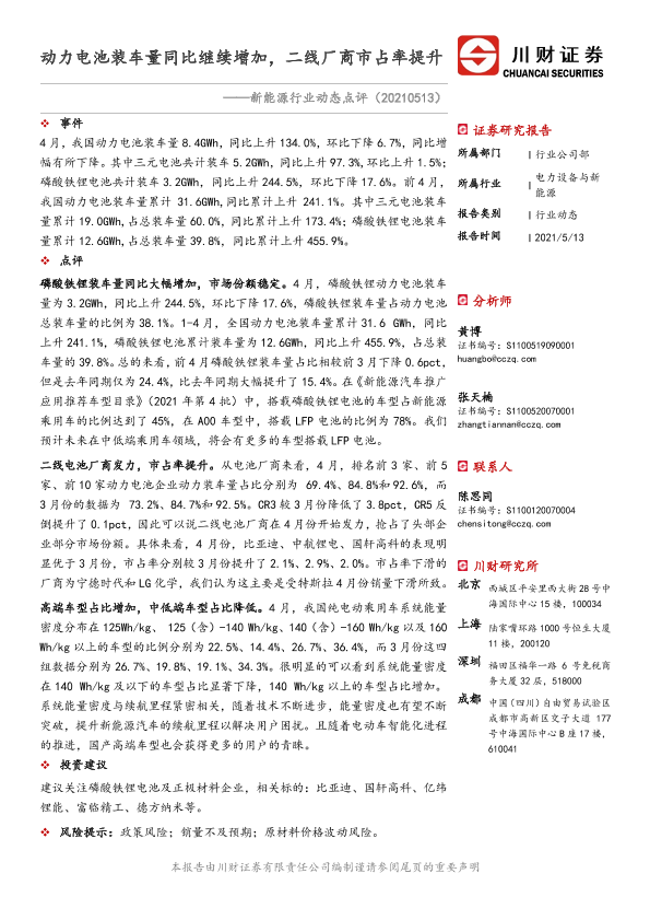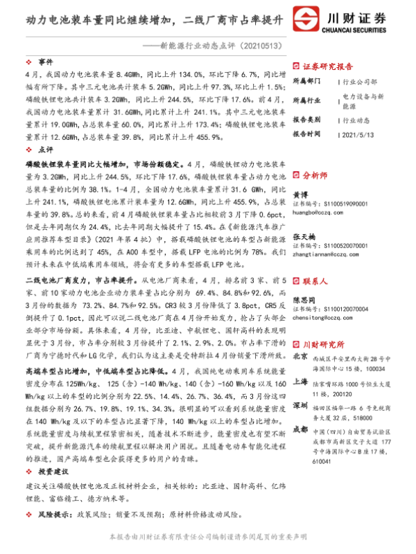 【川财证券】【20210513】新能源行业动态点评:动力电池装车量同比继续增加,二线厂商市占率提升-2页