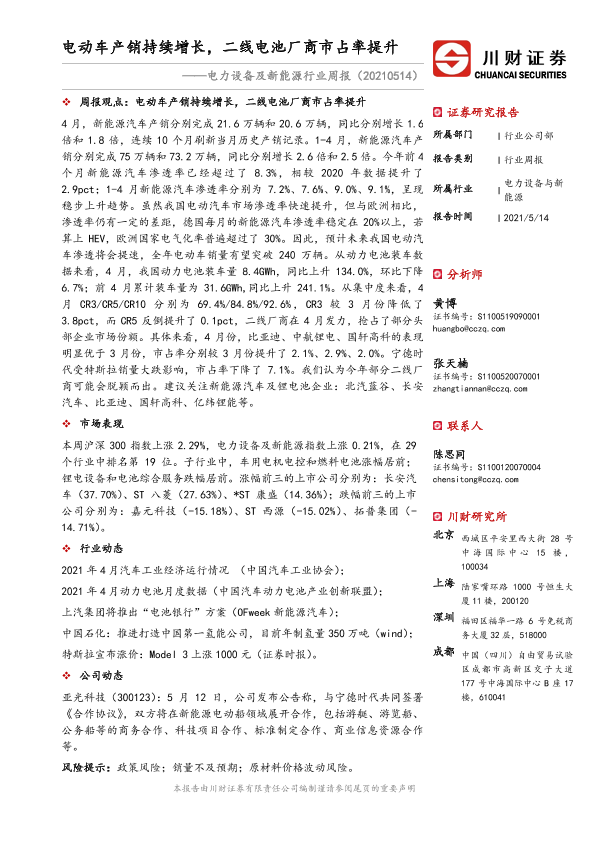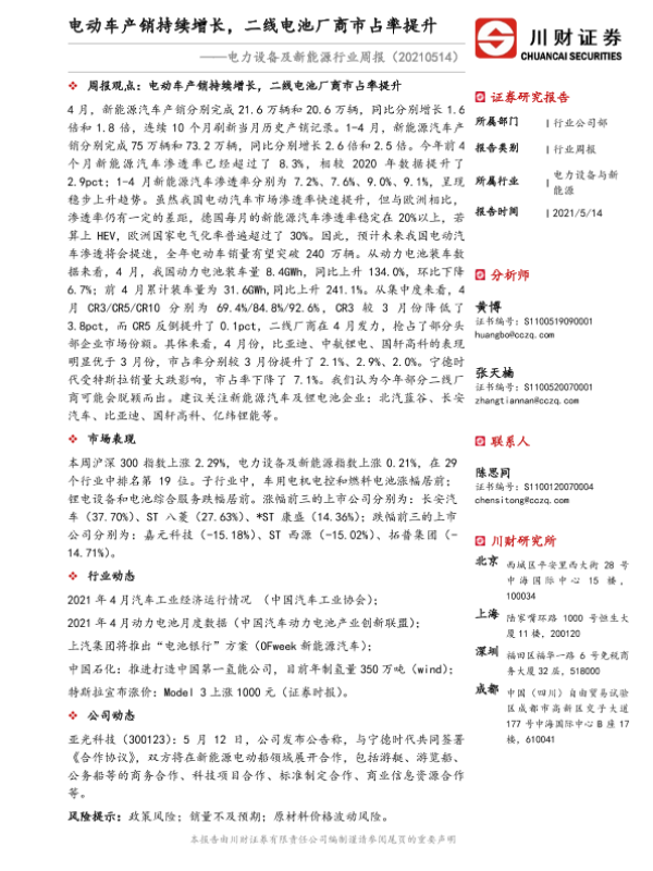 【川财证券】【20210514】电力设备及新能源行业周报:电动车产销持续增长,二线电池厂商市占率提升-14页