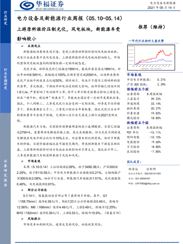 【华福证券】【20210514】电力设备及新能源行业周报:上游原料涨价压制光伏,风电板块,新能源车受影响较小-6页