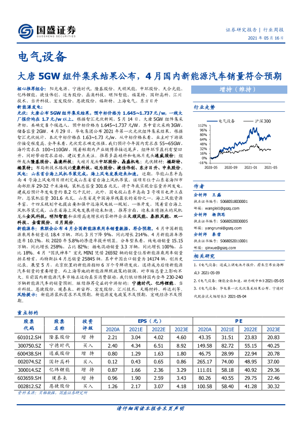 【国盛证券】【20210516】大唐5GW组件集采结果公布,4月国内新能源汽车销量符合预期-13页