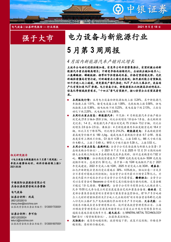 【中银证券】【20210518】电力设备与新能源行业5月第3周周报:4月国内新能源汽车产销同比增长-17页