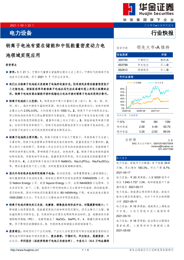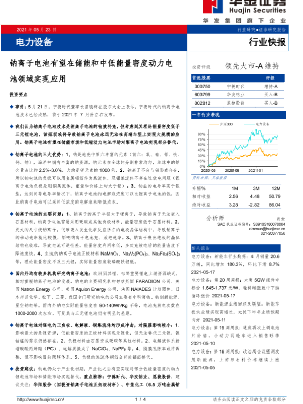 【华金证券】【20210523】电力设备:钠离子电池有望在储能和中低能量密度动力电池领域实现应用-4页