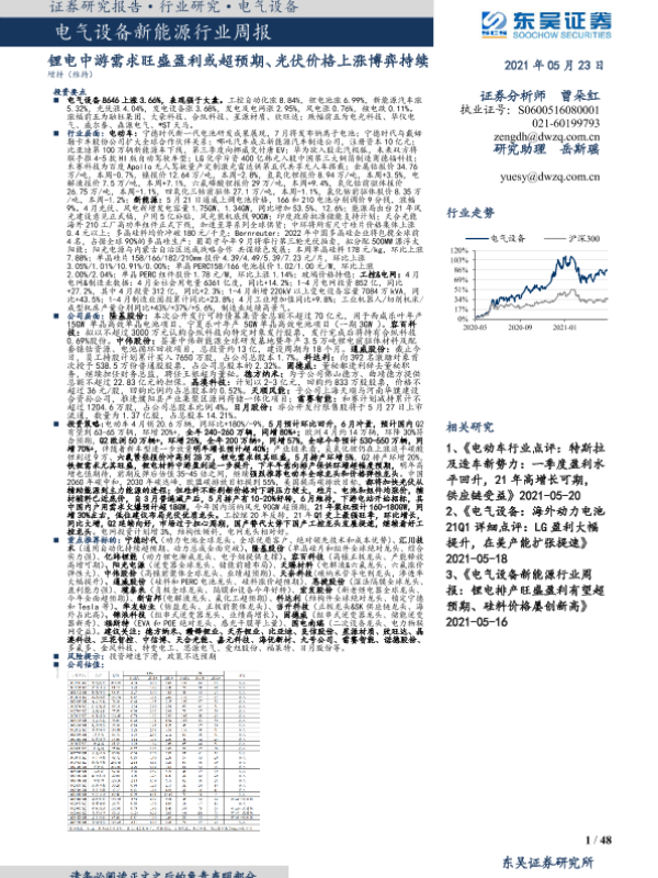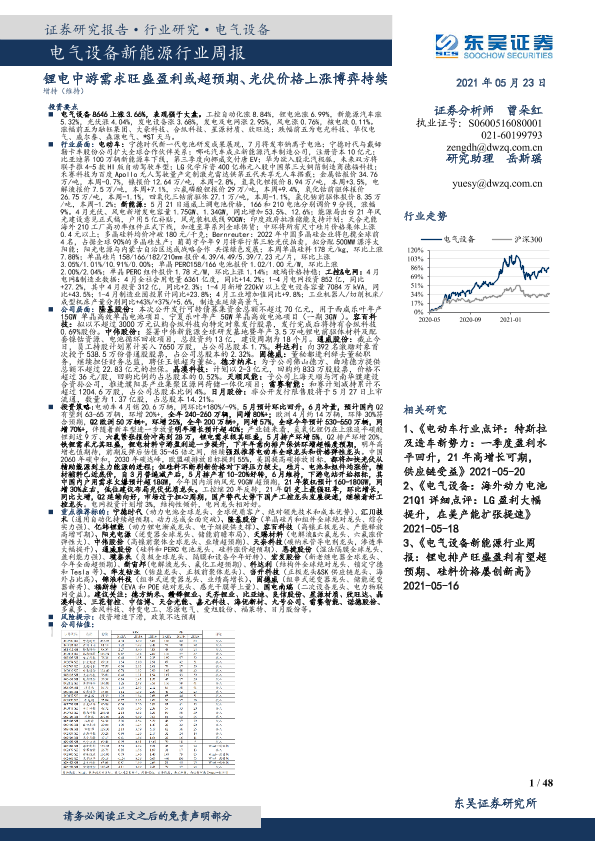 【东吴证券】【20210523】电气设备新能源行业周报:锂电中游需求旺盛盈利或超预期、光伏价格上涨博弈持续-48页