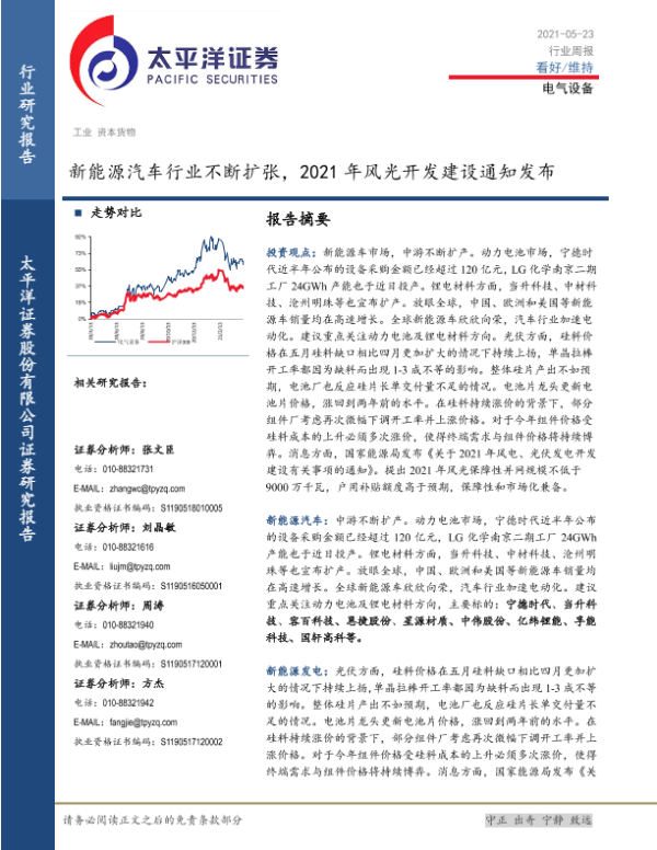 【太平洋证券】【20210523】电气设备行业周报:新能源汽车行业不断扩张,2021年风光开发建设通知发布-15页