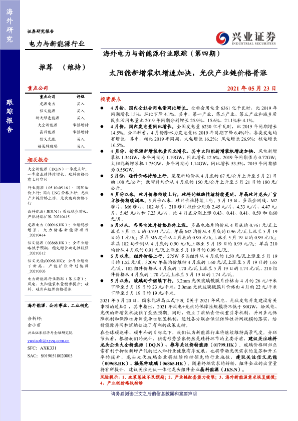 【兴业证券】【20210523】海外电力与新能源行业跟踪(第四期):太阳能新增装机增速加快,光伏产业链价格普涨-16页