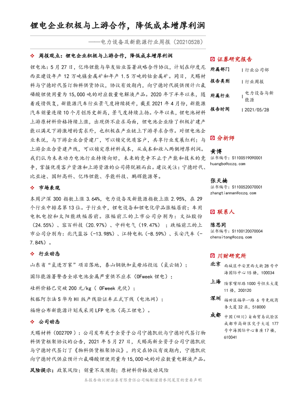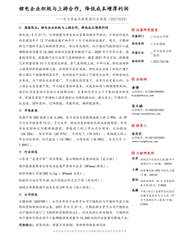 【川财证券】【20210528】电力设备及新能源行业周报:锂电企业积极与上游合作,降低成本增厚利润-15页