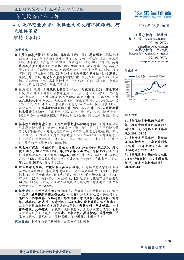 【东吴证券】【20210528】4月装机电量点评:装机量同比大增环比维稳,增长趋势不变-8页