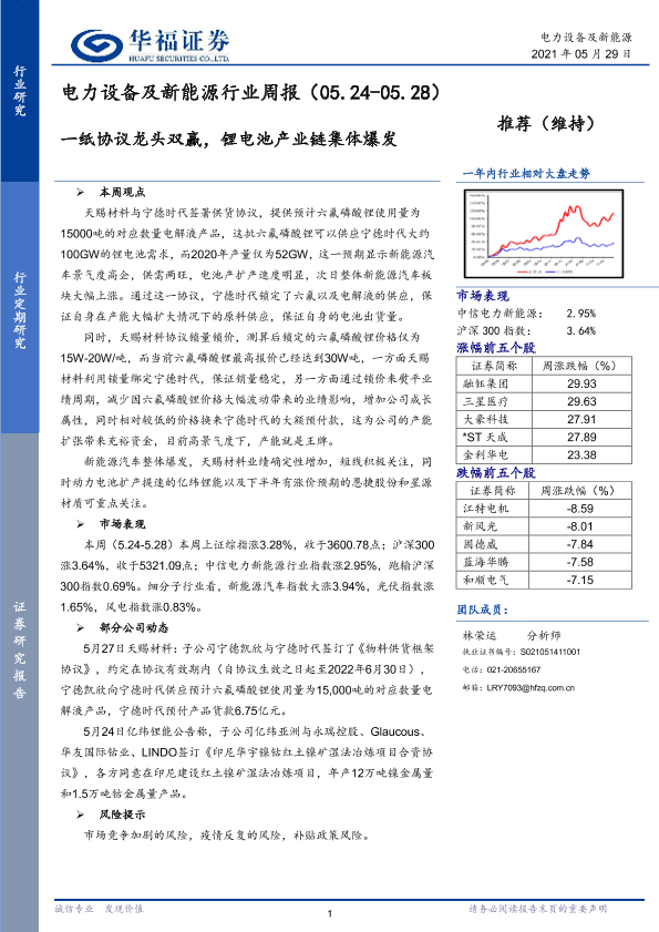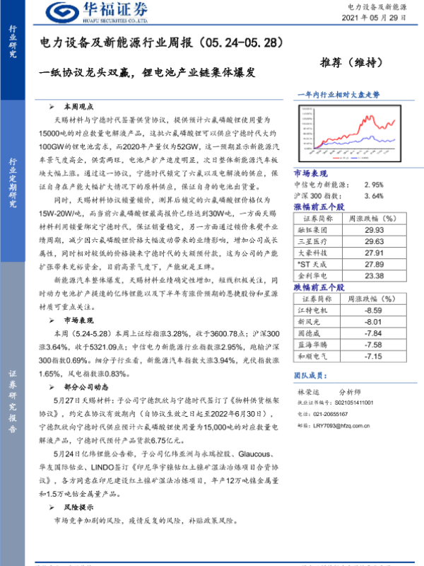 【华福证券】【20210529】电力设备及新能源行业周报:一纸协议龙头双赢,锂电池产业链集体爆发-6页