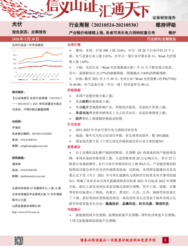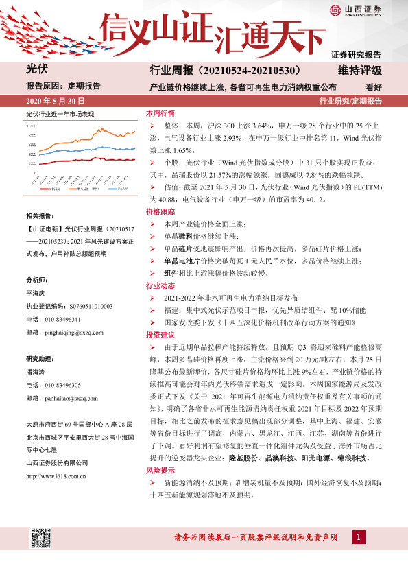 【山西证券】【20210530】光伏行业周报:产业链价格继续上涨,各省可再生电力消纳权重公布-10页
