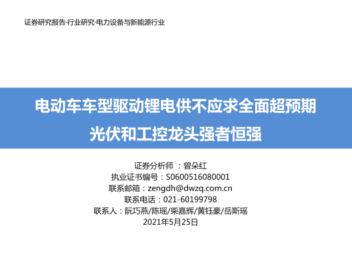 【东吴证券】【20210525】电力设备与新能源行业:电动车车型驱动锂电供不应求全面超预期 光伏和工控龙头强者恒强-90页