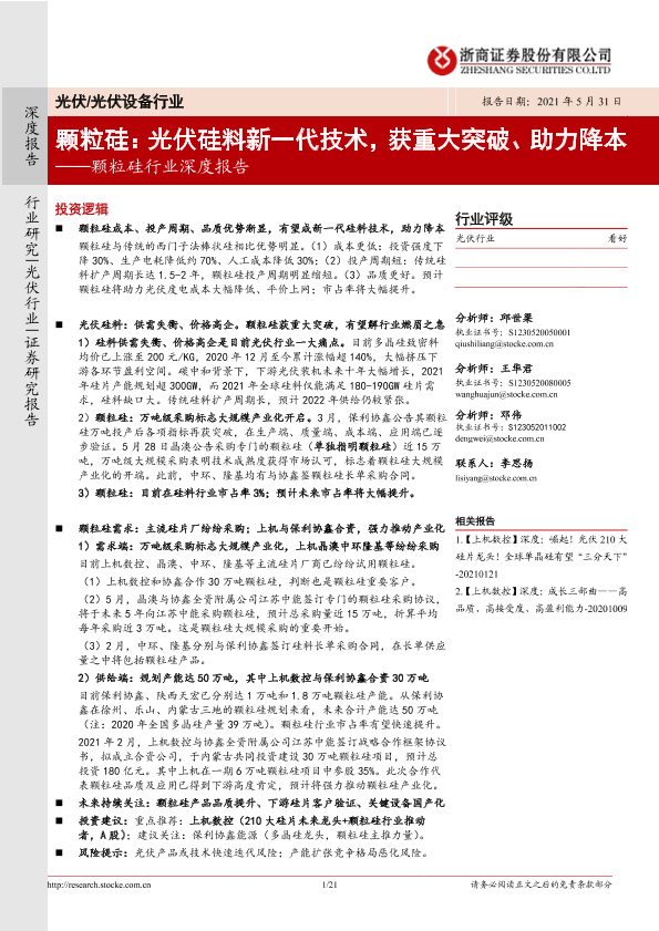 【浙商证券】【20210531】颗粒硅:光伏硅料新一代技术,获重大突破、助力降本-21页