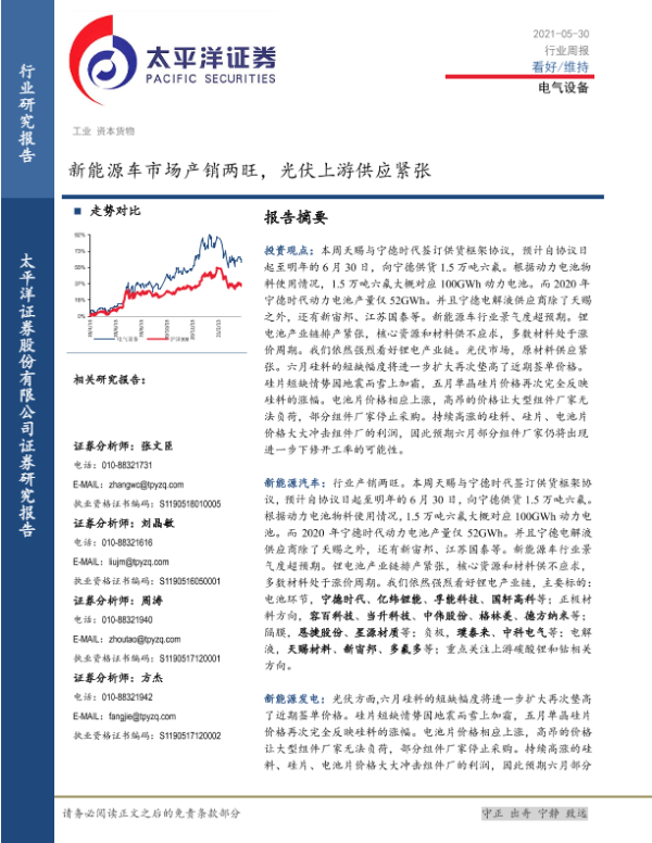【太平洋证券】【20210530】电气设备:新能源车市场产销两旺,光伏上游供应紧张-16页