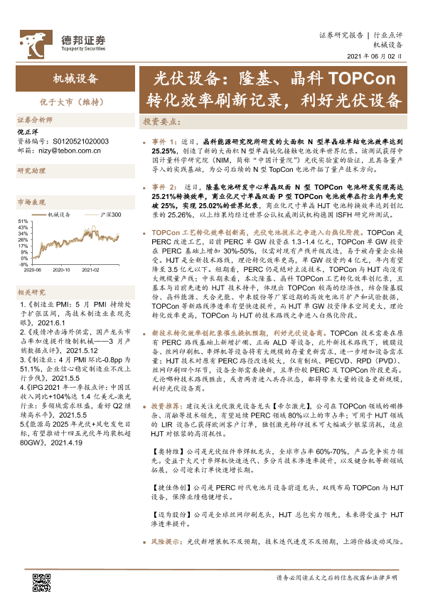【德邦证券】【20210602】光伏设备:隆基、晶科 TOPCon转化效率刷新记录,利好光伏设备-2页