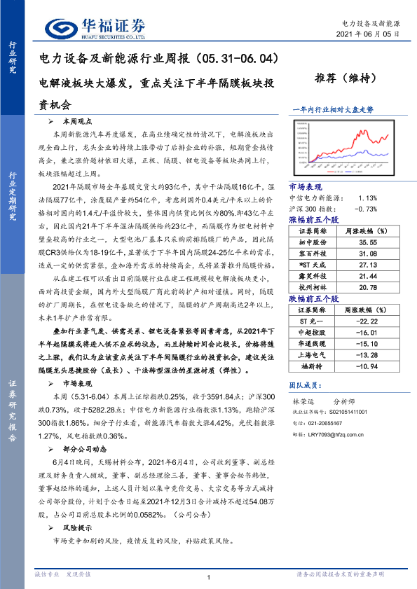 【华福证券】【20210605】电力设备及新能源行业周报:电解液板块大爆发,重点关注下半年隔膜板块投资机会-6页