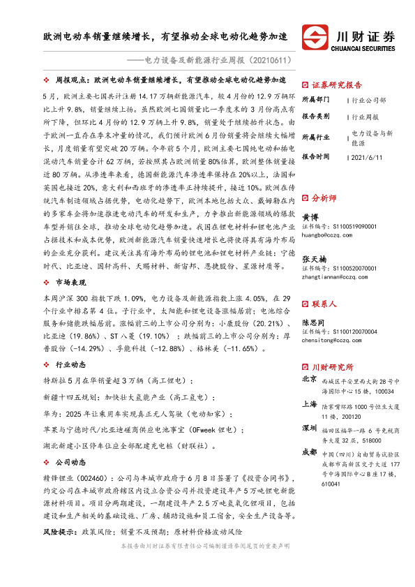 【川财证券】【20210611】电力设备及新能源行业周报:欧洲电动车销量继续增长,有望推动全球电动化趋势加速-13页