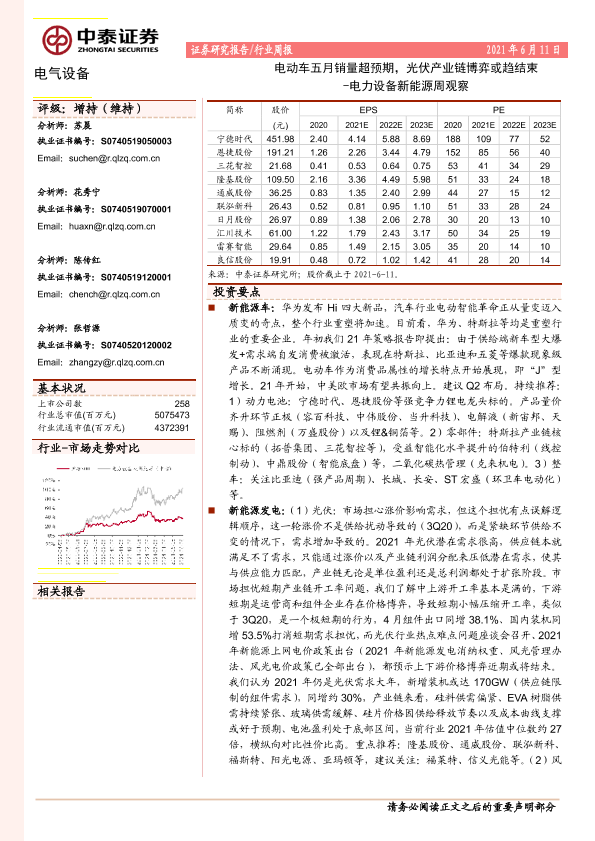 【中泰证券】【20210611】电力设备新能源周观察:电动车五月销量超预期,光伏产业链博弈或趋结束-20页
