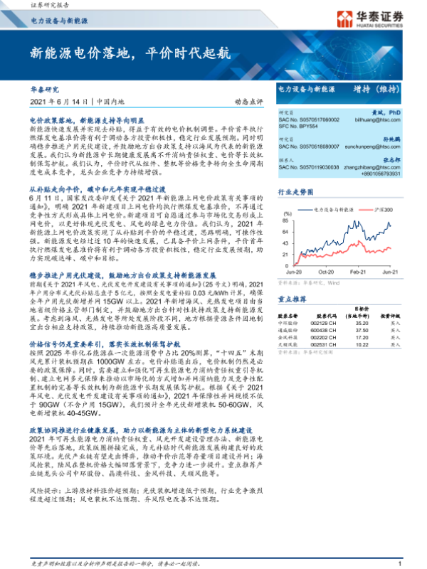 【华泰证券】【20210614】电力设备与新能源:新能源电价落地,平价时代起航-5页