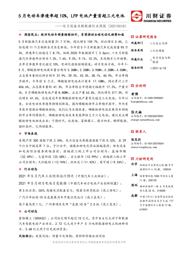 【川财证券】【20210618】电力设备及新能源行业周报:5月电动车渗透率超10%,LFP电池产量首超三元电池-13页