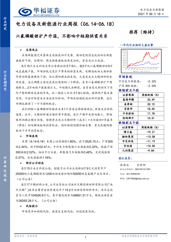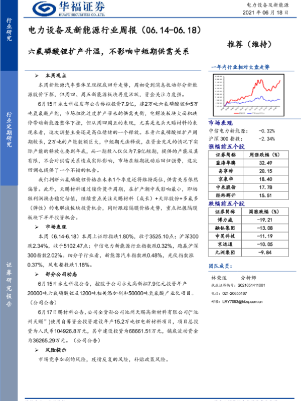 【华福证券】【20210618】电力设备及新能源行业周报:六氟磷酸锂扩产升温,不影响中短期供需关系-6页