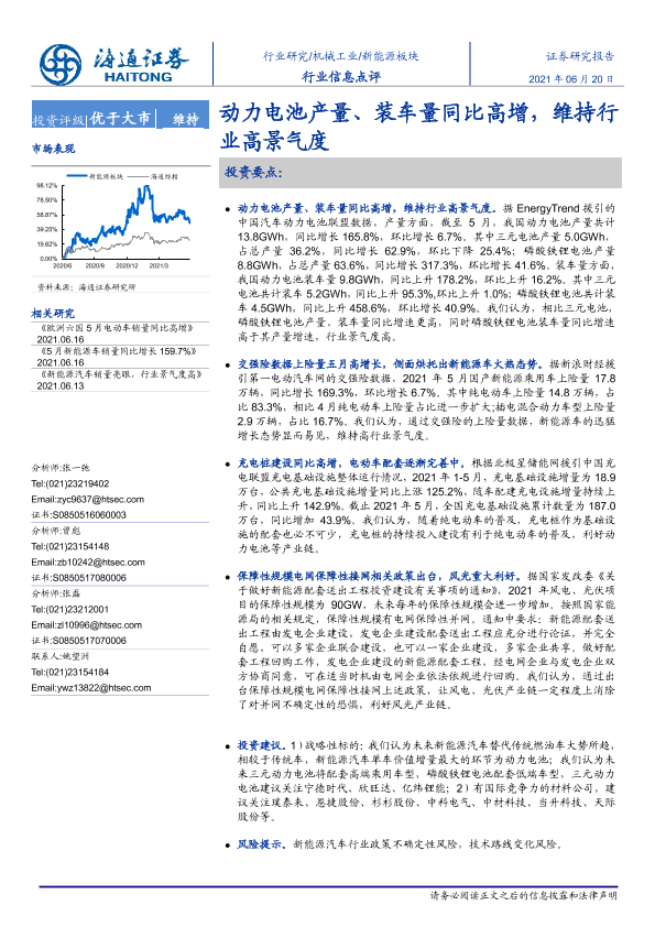 【海通证券】【20210620】新能源板块行业信息点评:动力电池产量、装车量同比高增,维持行业高景气度-2页