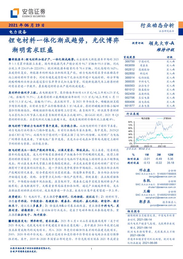【安信证券】【20210619】电力设备行业动态分析:锂电材料一体化渐成趋势,光伏博弈渐明需求旺盛-25页