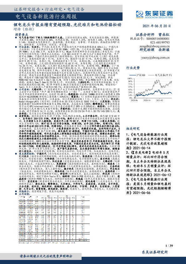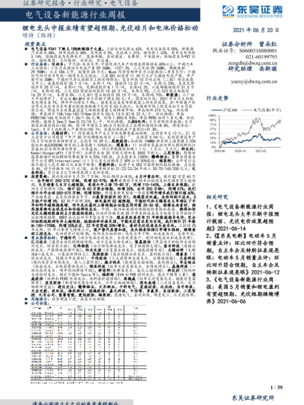 【东吴证券】【20210620】电气设备新能源行业周报:锂电龙头中报业绩有望超预期、光伏硅片和电池价格松动-39页