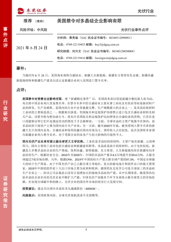 【东莞证券】【20210624】20210624-东莞证券-光伏行业事件点评:美国禁令对多晶硅企业影响有限-2页