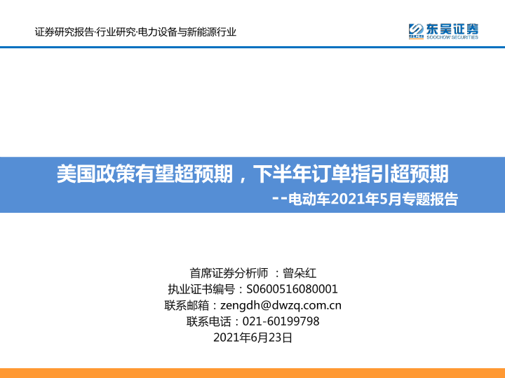 【东吴证券】【20210623】电动车2021年5月专题报告:美国政策有望超预期,下半年订单指引超预期-53页