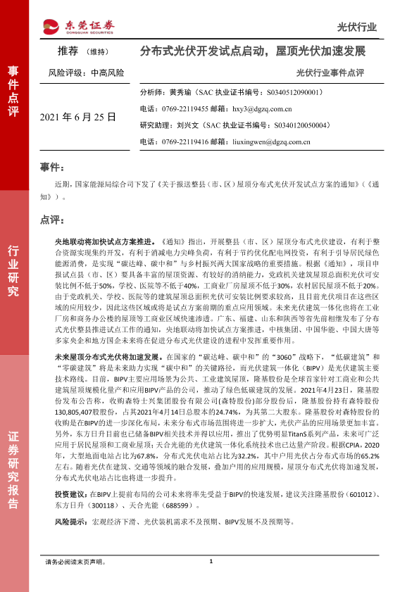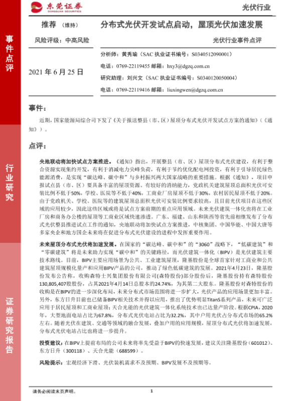 【东莞证券】【20210625】光伏行业事件点评:分布式光伏开发试点启动,屋顶光伏加速发展-2页