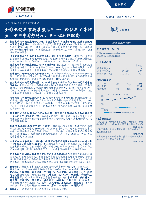 【华创证券】【20210627】全球电动车市场展望系列一:轻型车主导增量,重型车蓄势待发,充电桩加速配套-19页