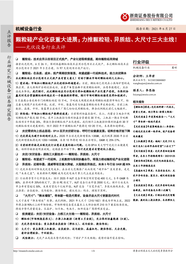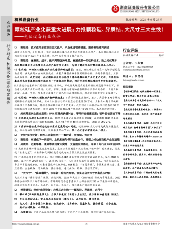 【浙商证券】【20210627】20210627-浙商证券-光伏设备行业点评:颗粒硅产业化获重大进展;力推颗粒硅、异质结、大尺寸三大主线!-6页