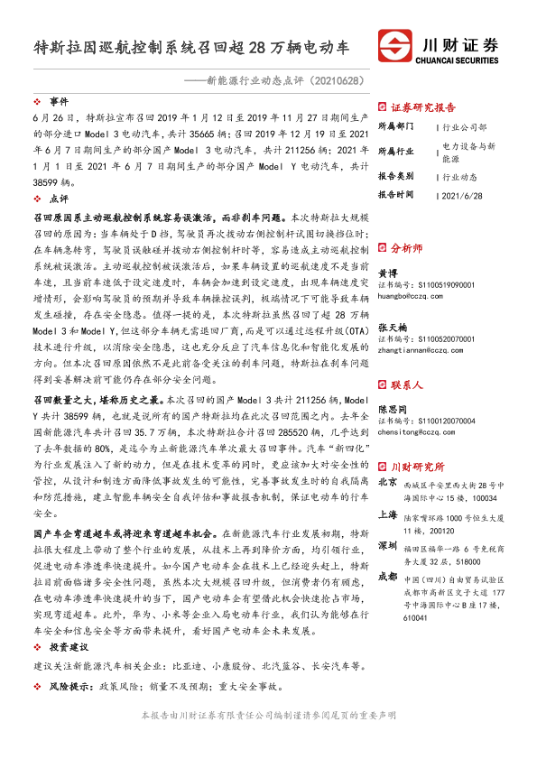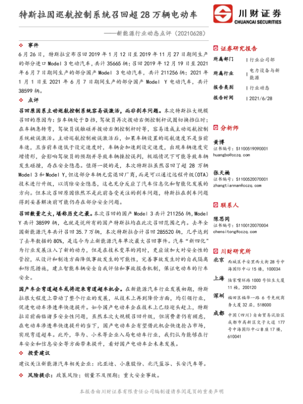 【川财证券】【20210628】新能源行业动态点评:特斯拉因巡航控制系统召回超 28 万辆电动车-2页
