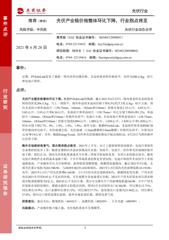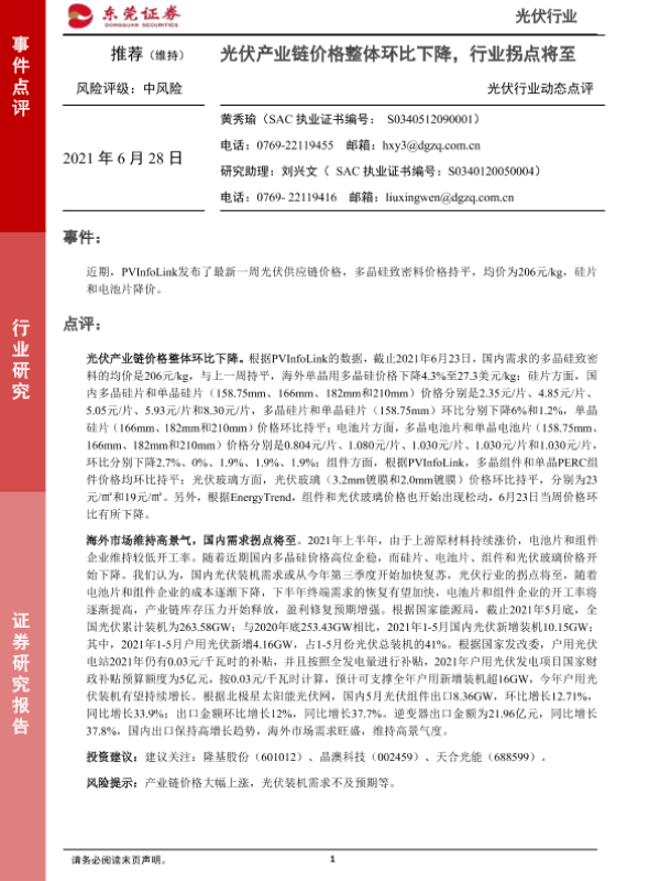 【东莞证券】【20210628】光伏行业动态点评:光伏产业链价格整体环比下降,行业拐点将至-2页