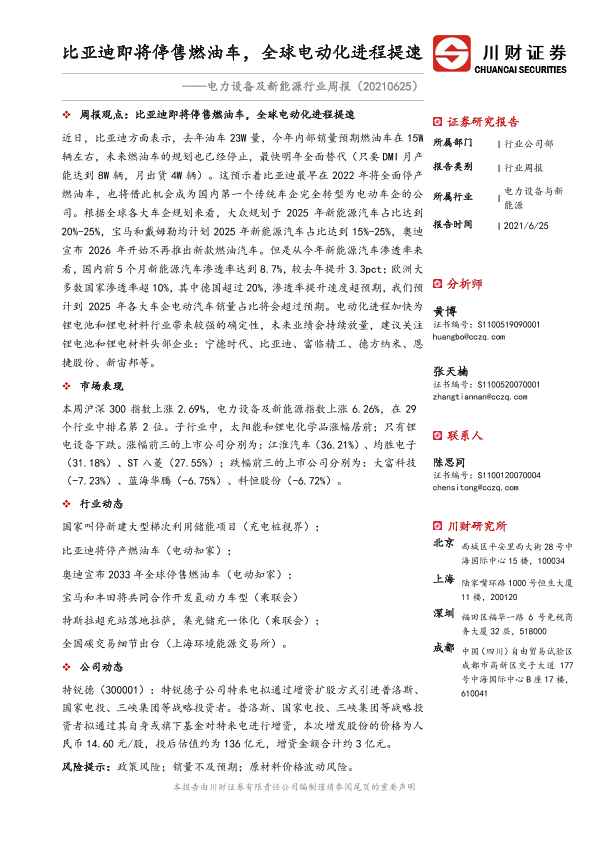 【川财证券】【20210625】电力设备及新能源行业周报:比亚迪即将停售燃油车,全球电动化进程提速-14页