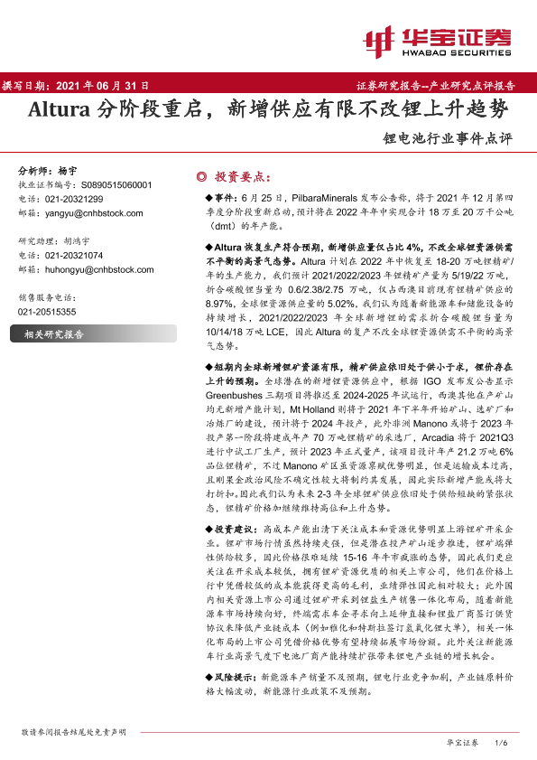 【华宝证券】【20210630】20210701-华宝证券-锂电池行业事件点评:Altura分阶段重启,新增供应有限不改锂上升趋势-6页