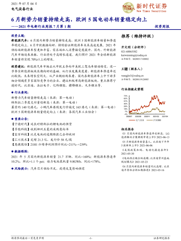 【新时代证券】【20210704】电气设备行业2021年电新行业周报7月第1期:6月新势力销量持续走高,欧洲5国电动车销量稳定向上-11页
