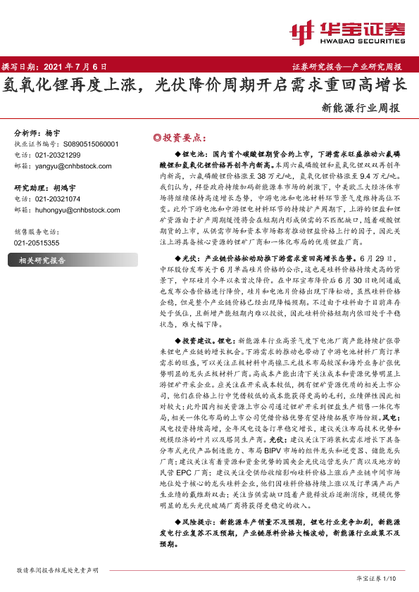 【华宝证券】【20210706】20210706-华宝证券-新能源行业周报:氢氧化锂再度上涨,光伏降价周期开启需求重回高增长-10页