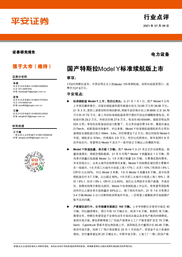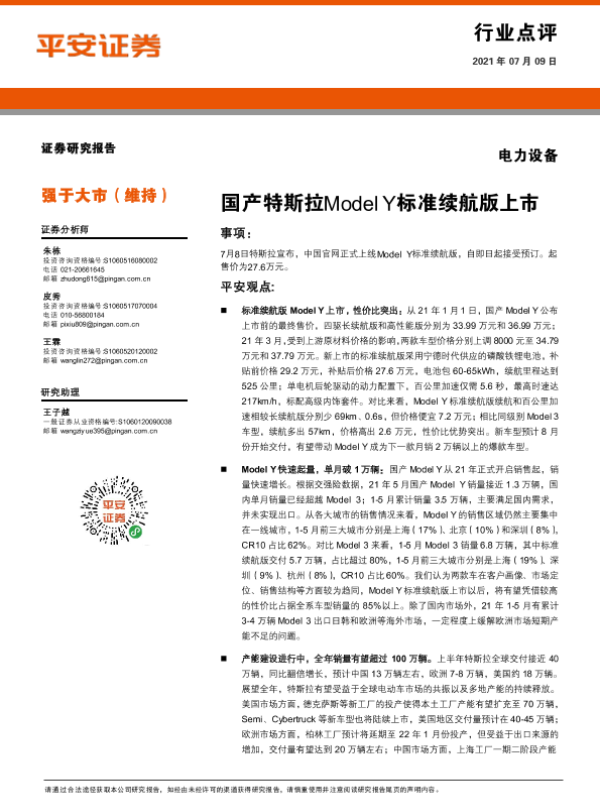【平安证券】【20210709】电力设备行业点评:国产特斯拉Model Y标准续航版上市-3页