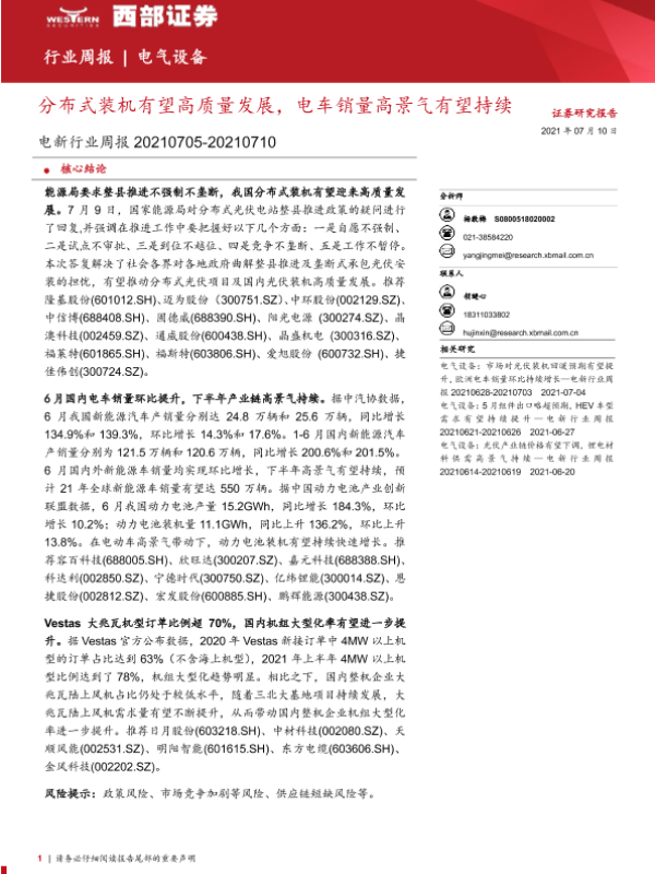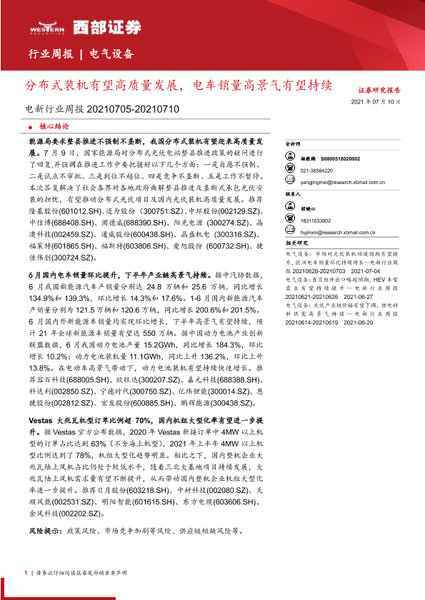 【西部证券】【20210710】电新行业周报:分布式装机有望高质量发展,电车销量高景气有望持续-15页
