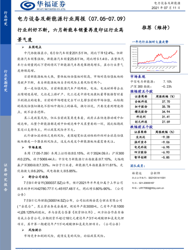 【华福证券】【20210711】电力设备及新能源行业周报:行业利好不断,六月新能车销量再度印证行业高景气度-6页