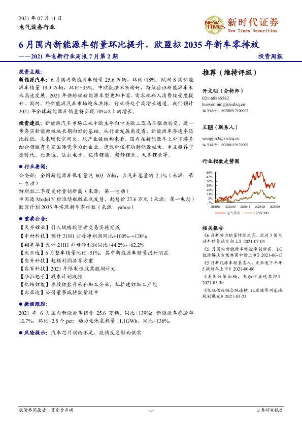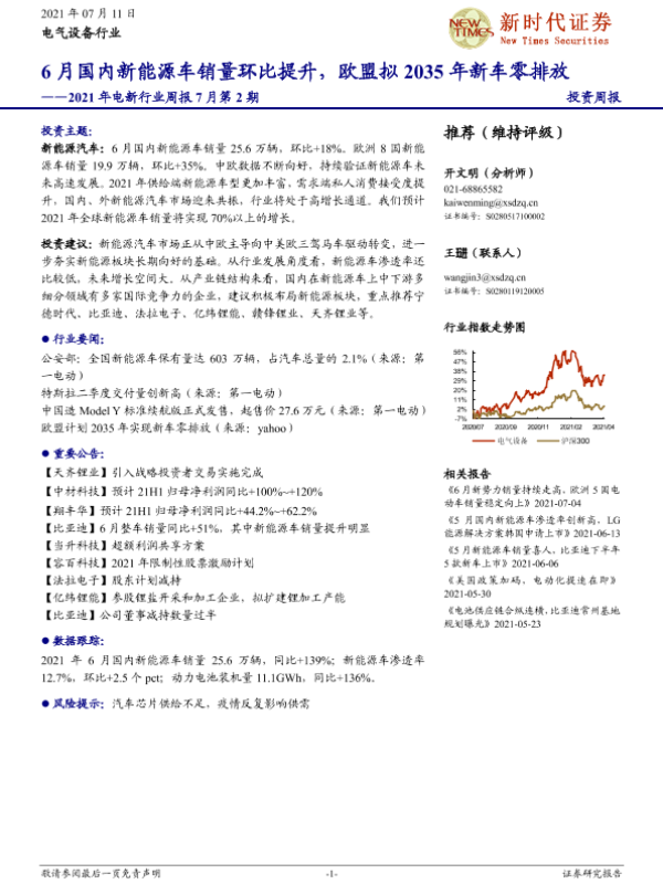 【新时代证券】【20210711】2021年电新行业周报7月第2期:6月国内新能源车销量环比提升,欧盟拟2035年新车零排放-11页