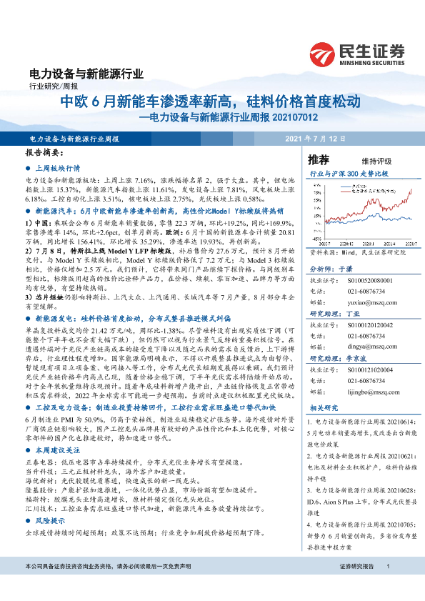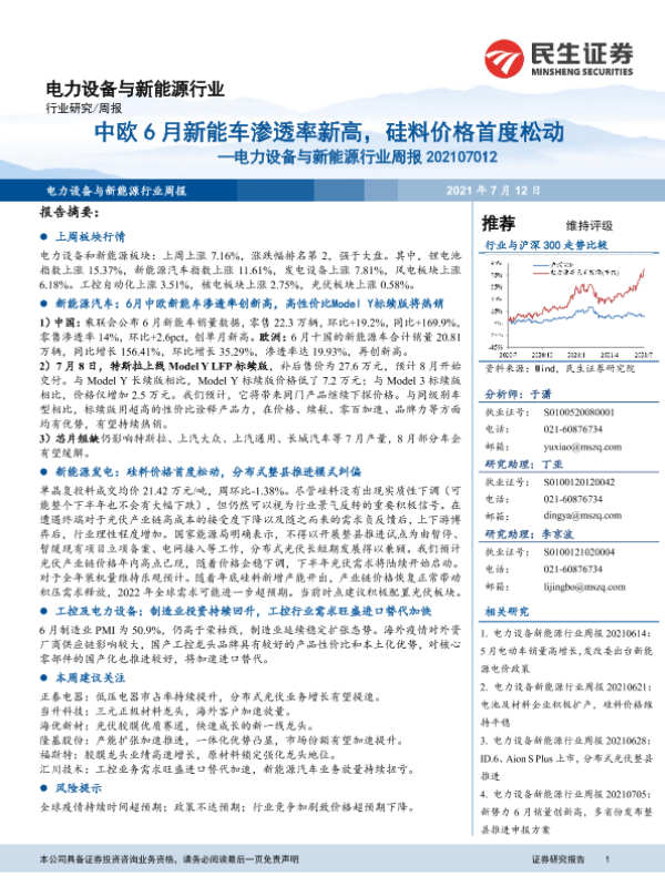 【民生证券】【20210712】电力设备与新能源行业周报:中欧6月新能车渗透率新高,硅料价格首度松动-23页