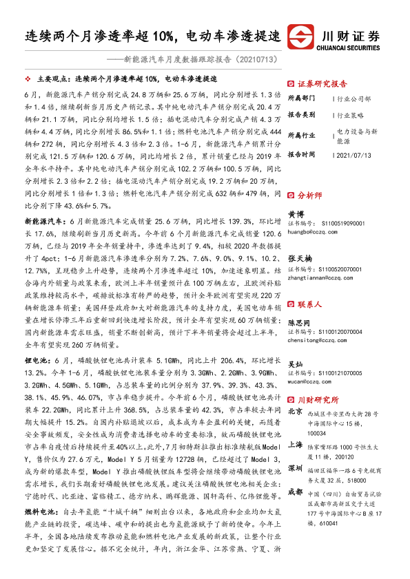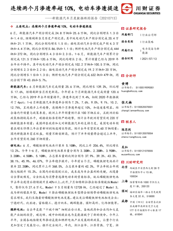 【川财证券】【20210713】新能源汽车月度数据跟踪报告:连续两个月渗透率超10%,电动车渗透提速-20页