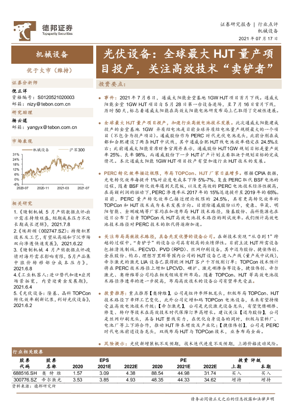 【德邦证券】【20210717】光伏设备:全球最大HJT量产项目投产,关注高效技术“卖铲者”-2页