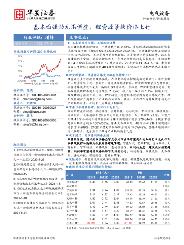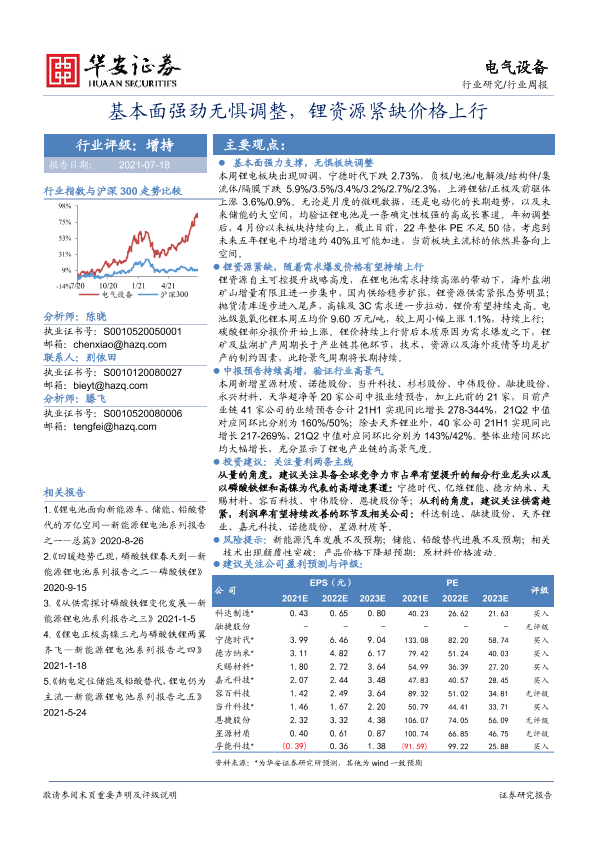 【华安证券】【20210718】电气设备行业周报:基本面强劲无惧调整,锂资源紧缺价格上行-22页