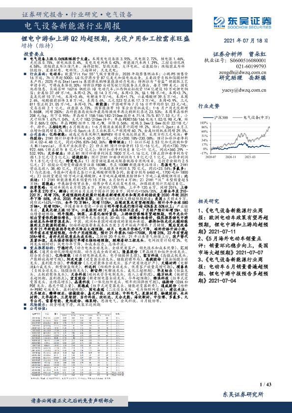 【东吴证券】【20210718】电气设备新能源行业周报:锂电中游和上游Q2均超预期,光伏户用和工控需求旺盛-43页