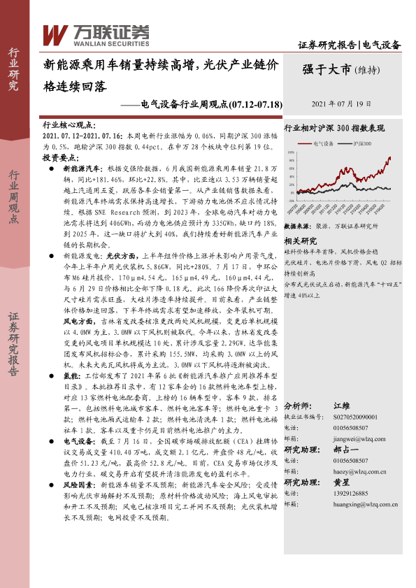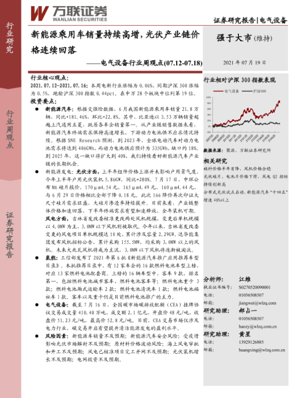 【万联证券】【20210719】电气设备行业周观点:新能源乘用车销量持续高增,光伏产业链价格连续回落-12页
