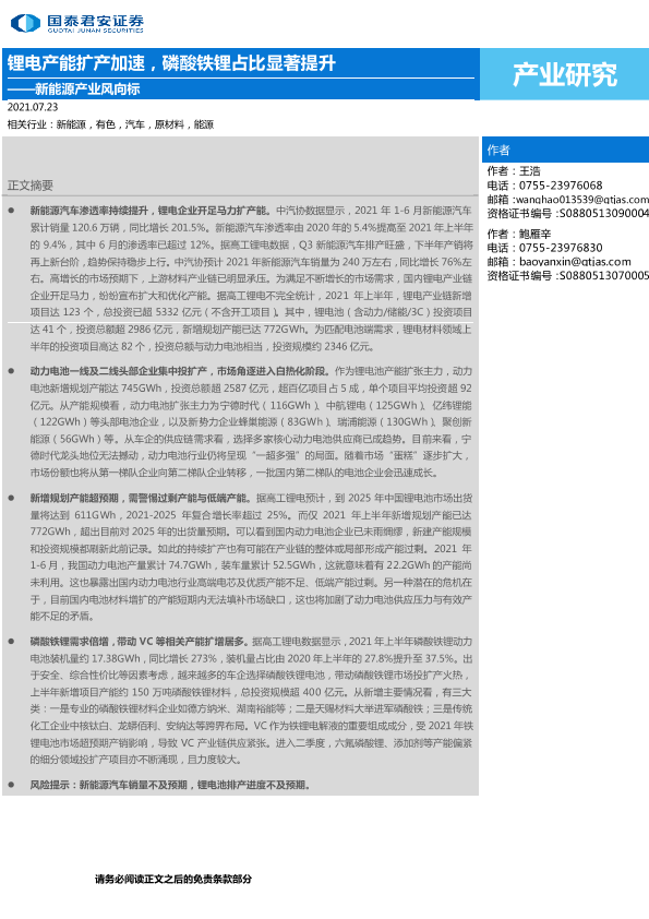 【国泰君安证券】【20210723】新能源产业风向标:锂电产能扩产加速,磷酸铁锂占比显著提升-2页