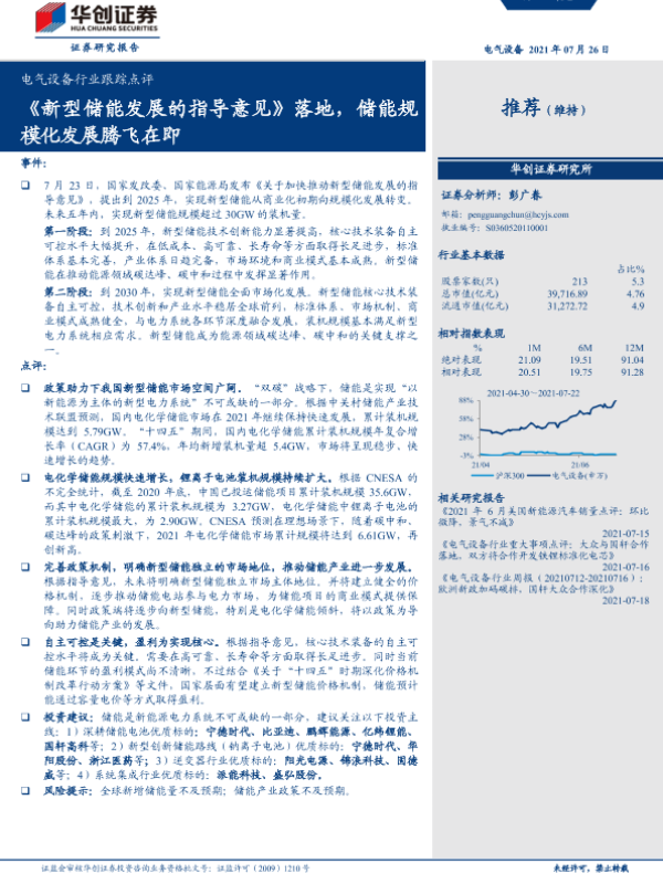 【华创证券】【20210726】电气设备行业跟踪点评:《新型储能发展的指导意见》落地,储能规模化发展腾飞在即-3页
