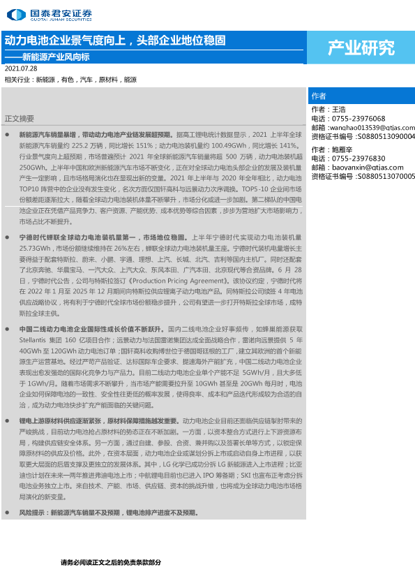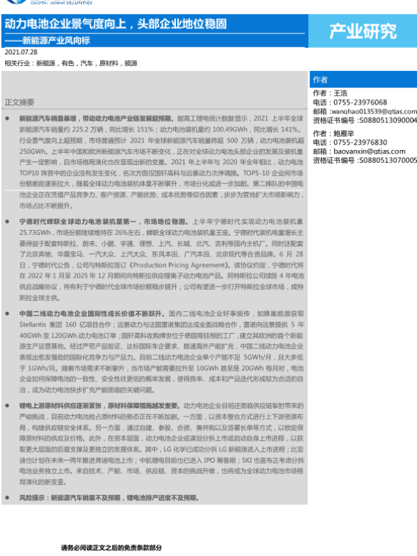 【国泰君安证券】【20210728】新能源产业风向标:动力电池企业景气度向上,头部企业地位稳固-2页